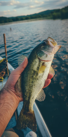 Angler's hand gently holding a largemouth bass against a calm lake with forested hills under a cloudy sky, representing the joy of successful fishing and outdoor recreation