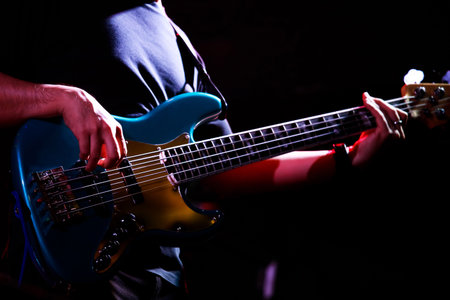 playing bass guitar in concert, detail