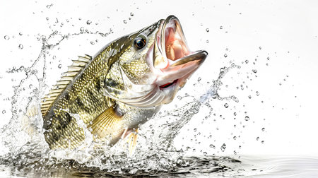 A large river bass lunges through the water, mouth wide open, creating dynamic splashes against a clean white backdrop.