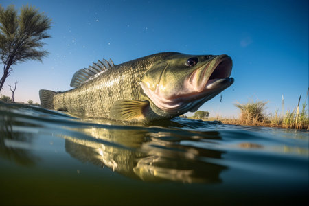 Dynamic image of largemouth bass fish jumping out of the water, showcasing power and motion in freshwater environment.