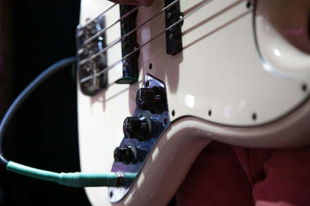 Close up view of musician plays bass guitar indoors.