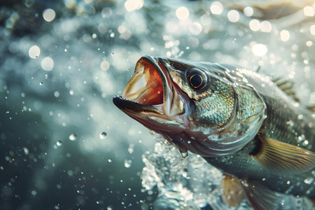 A stunning image of a large bass fish leaping out of the water, displaying its strength and grace. The sunlight enhances the glistening scales, capturing every detail of its mesmerizing movement.