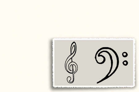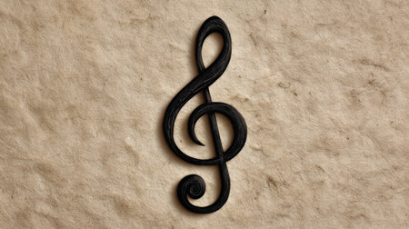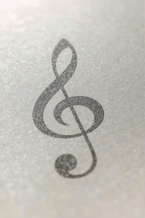 Close-up of a black treble clef symbol printed on a textured white background. Elegant and minimal design. Ideal for music, notation, and artistic compositions.