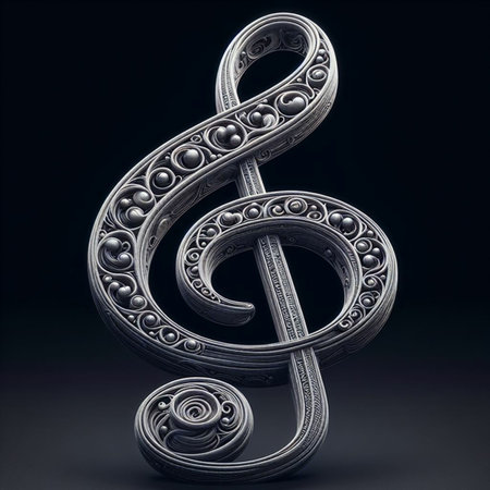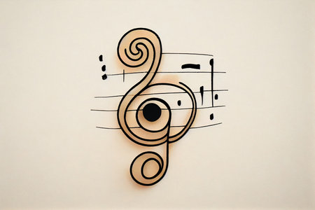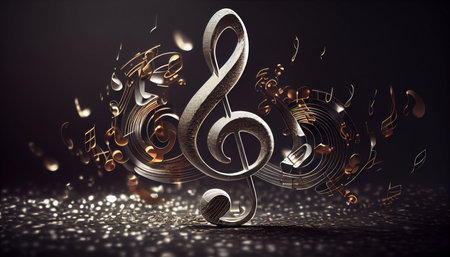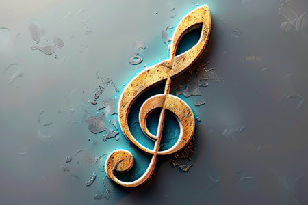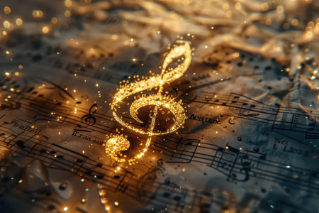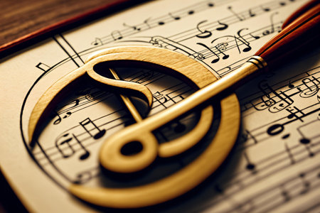 A close-up image showcases a gold and black treble clef crafted on a textured surface, surrounded by musical notes. The composition is set against a backdrop of musical sheets and a pencil. This artistic piece employs a low angle view with soft lighting and shadow for potential use in editorial or commercial projects.
