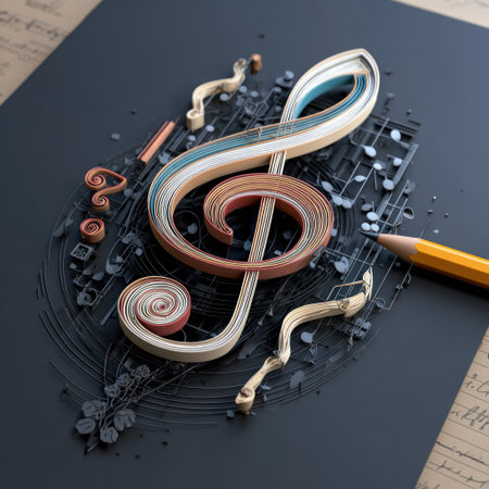 This image features a detailed paper quilling representation of a musical note, rendered with various colors and textures, set against a dark background. The composition includes musical notation elements and a pencil, suggesting an artistic process. The image has potential uses for educational materials, design projects, and creative editorial content.