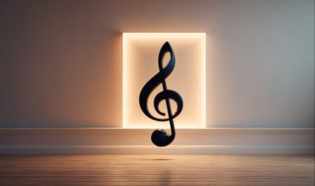 A black treble clef floats in front of a glowing light box in a room with wooden floors