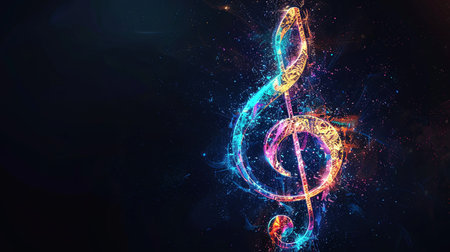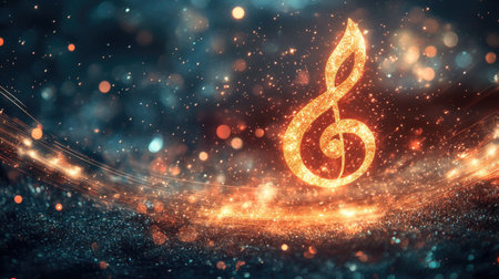 Illuminated treble clef symbol surrounded by vibrant, glowing abstract waves and sparkles on a dark gradient background. Futuristic and artistic music concept.