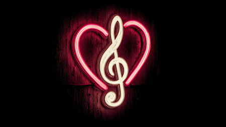 A neon heart and treble clef illuminate a dark background, crafted from wood. The warm red glow of the heart embraces the central musical symbol, suggesting a theme of passion and sound. This composition may be suitable for promotional materials, decorative design, and various artistic endeavors.