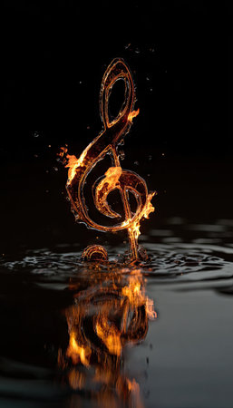 A burning musical symbol appears to emerge from water, its form defined by glowing flames. The image features a dark background, enhancing the contrast of the bright orange and yellow fire. Reflections on the water's surface create a symmetrical effect. This visual concept is well-suited for a variety of media uses.