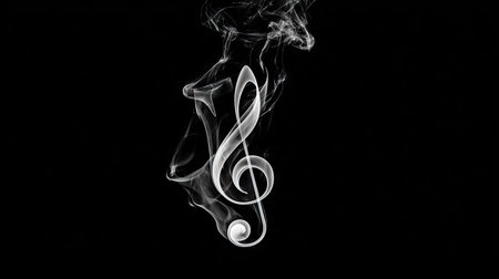 A grayscale image displays a treble clef formed by swirling smoke against a stark black background. The smoke creates a textured, ethereal form, with soft gradients and delicate wisps. The composition is simple, with strong contrast and dramatic lighting emphasizing the musical symbol. Suitable for a range of creative projects, including editorial use.