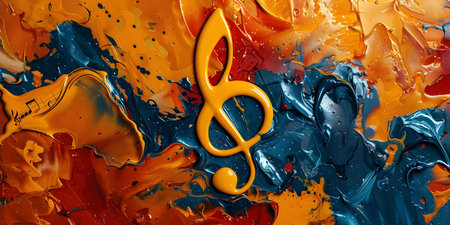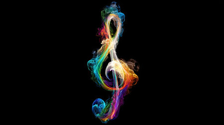 A vibrant treble clef illustration is created using swirling, multicolored smoke. The stylized image exhibits an abstract form with blended hues of yellow, orange, blue and green. The composition, set against a dark backdrop, is suitable for various design projects and can be utilized in both commercial and editorial contexts.