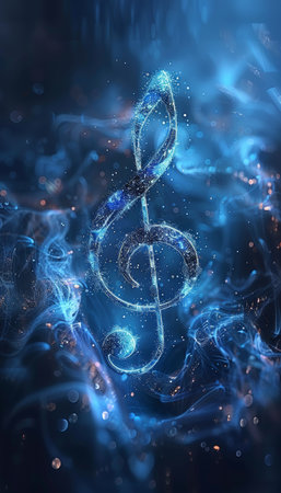 A radiant treble clef, rendered in shimmering particles, floats against a backdrop of swirling celestial nebulas. The composition features a deep blue palette with highlights of light. Its style evokes an ethereal quality, suggesting a dreamlike cosmic setting, suitable for various creative design projects.