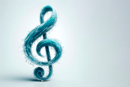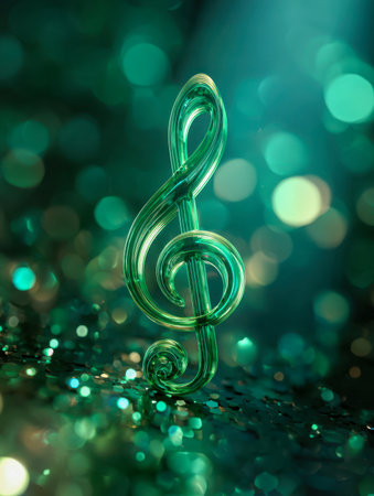 A luminous, glass-like green treble clef stands out against a shimmering teal bokeh backdrop, evoking harmony and artistic inspiration.