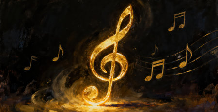 A mesmerizing golden musical note radiates energy against a dark background, symbolizing creativity and inspiration in the world of music and art.