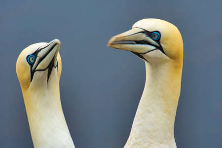 Portrait of pair of Northern Gannet, Sula bassana, Two birds love in soft light, animal love behavior. Soft light in high-key.
