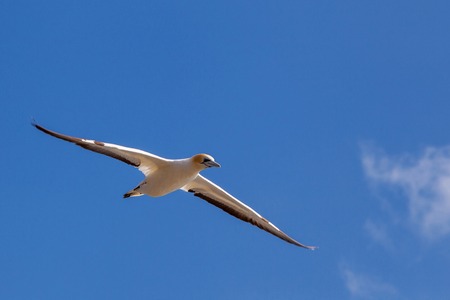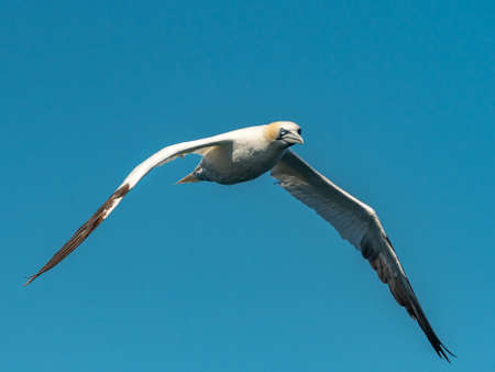 A Northern Gannet (Morus bassanus) in flight on a sunny day summer, blue sky, Les Sept Iles, Brittany (France)