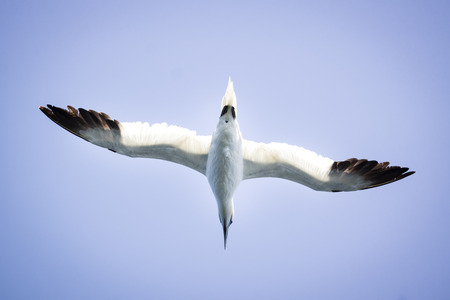 Northern gannet in flight under the sky