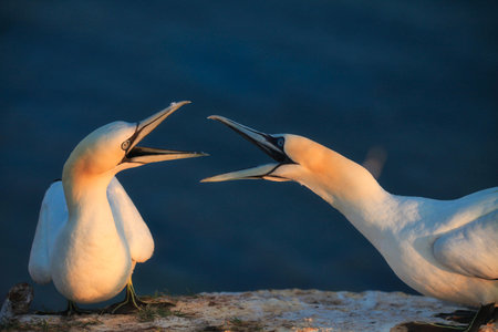 struggling gannets on Heligoland at evening sun