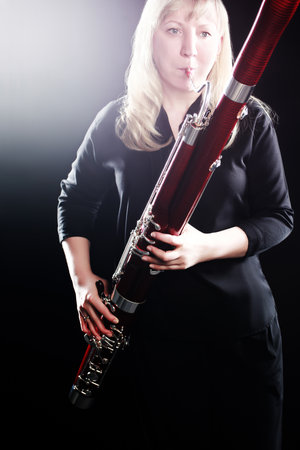 Bassoon woodwind instruments player. Classical musician woman playing orchestral bass. Wind instrument