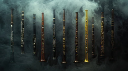 A stunning collection showcasing a variety of recorders in an atmospheric, fog-filled background, emphasizing the beauty and craftsmanship of these musical instruments.