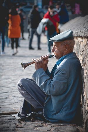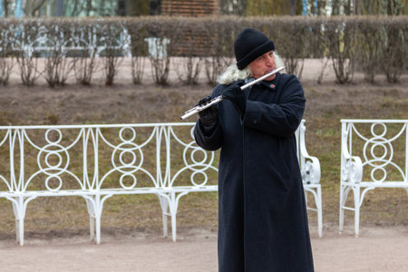 Saint Petersburg, Russia, 20.04.2019, gray-haired man plays the flute outdoors.