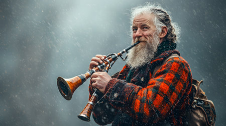 A smiling elderly man plays a wooden wind instrument, dressed warmly in a colorful plaid coat, amidst falling snow. The background appears hazy and atmospheric.