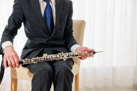 Bassoon orchestra player. Woodwind music instruments. Orchestral bass. Classical musical instrument close up