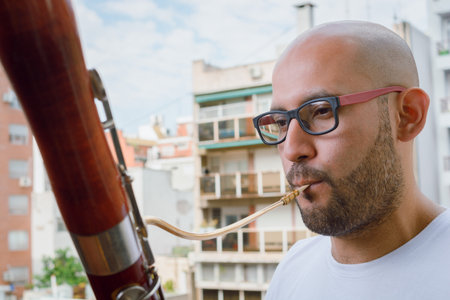 young latino venezuelan saxophonist man, with glasses, beard, white clothes and bald, very concentrated playing the bassoon outdoors, practicing and studying classical music. horizontal portrait.