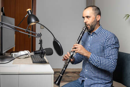 Young entrepreneur playing the clarinet at home and recording music to stream it online with his computer
