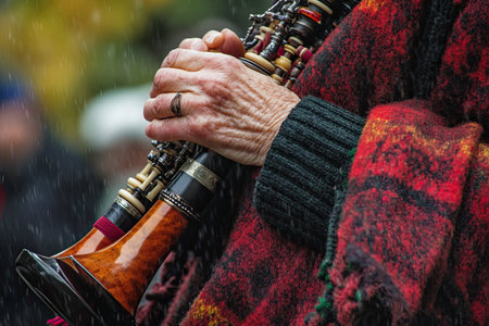 Charismatic Bagpipe music man portrait. Summer musical piper player. Generate Ai