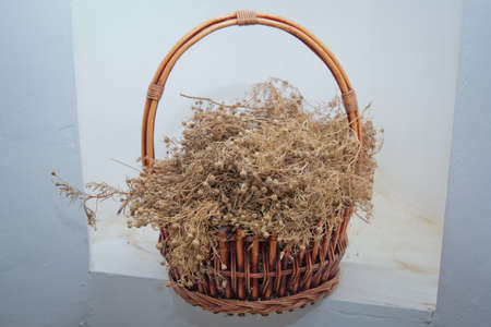 Dried Peganum harmala are hung in homes or vehicles . Peganum harmala herb, medicinal herbs, herbal plants, medicinal plants . Dried Harmal on display in the basket