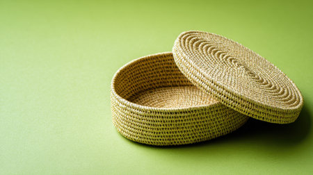 A beautiful handwoven basket with an open lid rests on a vibrant green background, perfect for showcasing eco-friendly lifestyle choices and home decor ideas.