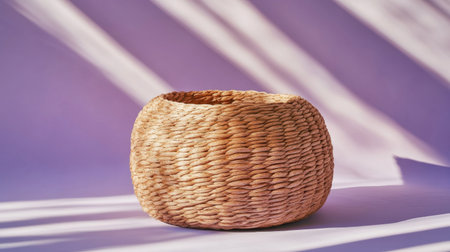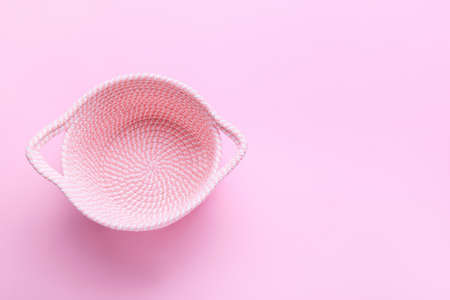 A beautifully woven wicker basket sits elegantly against a soft pink background, perfect for home decor, storage solutions, or artistic displays.