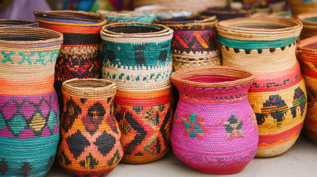 This captivating image showcases an array of handwoven baskets featuring unique and colorful patterns, symbolizing rich cultural traditions and artisan craftsmanship.