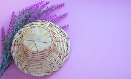 A basket in the shape of a hat lies on a branch of artificial lavender on a pink background. Space for your text.
