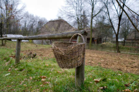 An old wicker basket hanging on a wooden fence in a village in Podlasie, Poland
