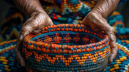 Indigenous Peoples Day. A close-up shot of an Indigenous artisan weaving a traditional basket, their hands moving with practiced skill and precision.