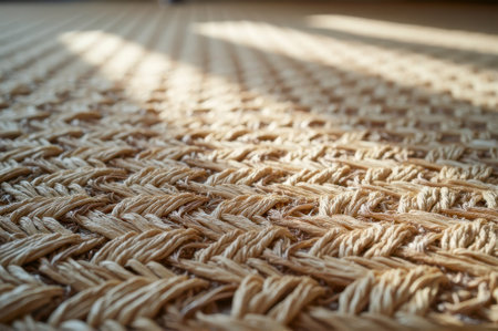 Close-up of a rustic, natural fiber weave, showcasing its intricate pattern and tactile surface. Warm, directional lighting emphasizes the texture, creating depth and shadow play.