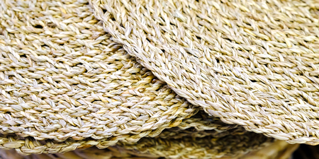 Woven circle Mat of reeds or straw-yellow in color. The texture of dry cane. Dark yellow.