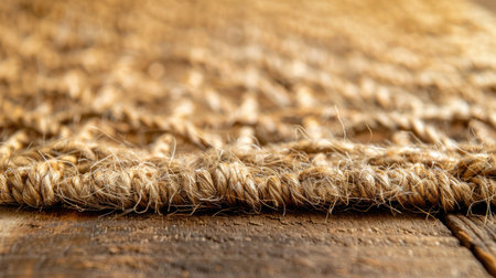 A detailed close-up of a textured natural fiber rope laid on a wooden surface, showcasing warm earthy tones and a cozy aesthetic perfect for home decor.