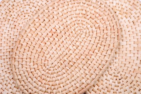 Round braided natural straw table mat texture as a background. Full frame of tightly woven straw pattern. Ppace, copy space for text, for a background