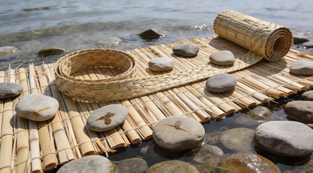 Woven straw mat on beach sand with colorful pebbles at sunset. That the image is generated using AI.
