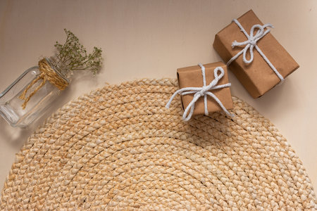 The flat lay of a glass vase with flowers and gift boxes on the round jute table mat, on the beige background, the concept of St. Valentine's day