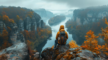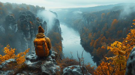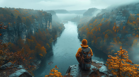 A solo traveler sits on a rocky outcrop, gazing at a serene river winding through a misty valley with dramatic rock formations and vibrant autumn foliage.