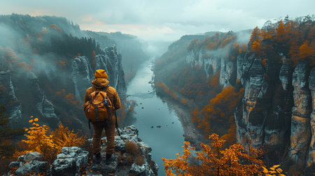 A person in a yellow jacket stands on a cliff edge, gazing at a scenic misty river valley during autumn. Majestic rock formations and colorful trees.
