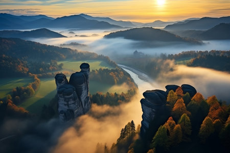 Spectacular sunrise at Bastei bridge reveals the beauty of Saxon Switzerland. The Elbe Sandstone Mountains emerge above mist and trees, creating an enchanting landscape.
