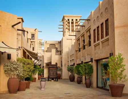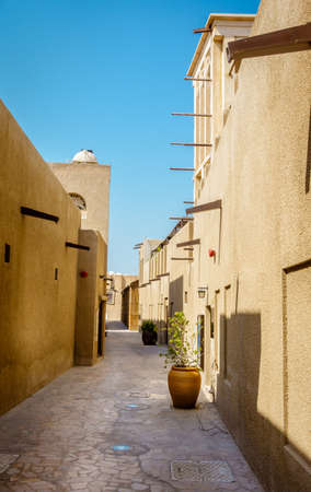 View of narrow clean streets between traditional stone buildings in old city Souk Madinat Jumeirah, Al Fahidi, Dubai, UAE, United Arab Emirates
