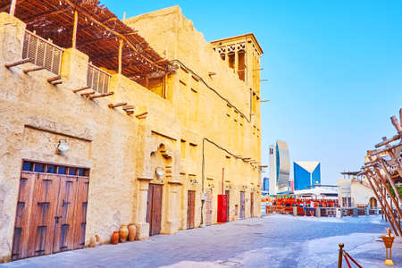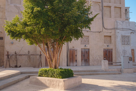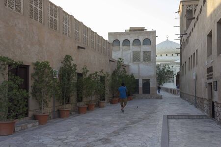 Travel destinations and heritage village of old Dubai. Arab Street in the old part of Dubai. Al Seef Clay Houses. Deira, BurDubai, Bright sunny afternoon on stone street in traditional oriental city.