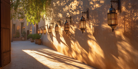 Lanterns cast shadows on a wall in a quiet alley at sunset