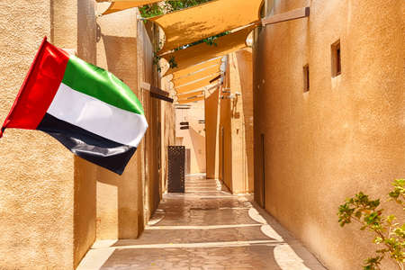 Old Dubai. Traditional Arabic streets in historical Al Fahidi district, Al Bastakiya. Dubai, United Arab Emirates with flag.